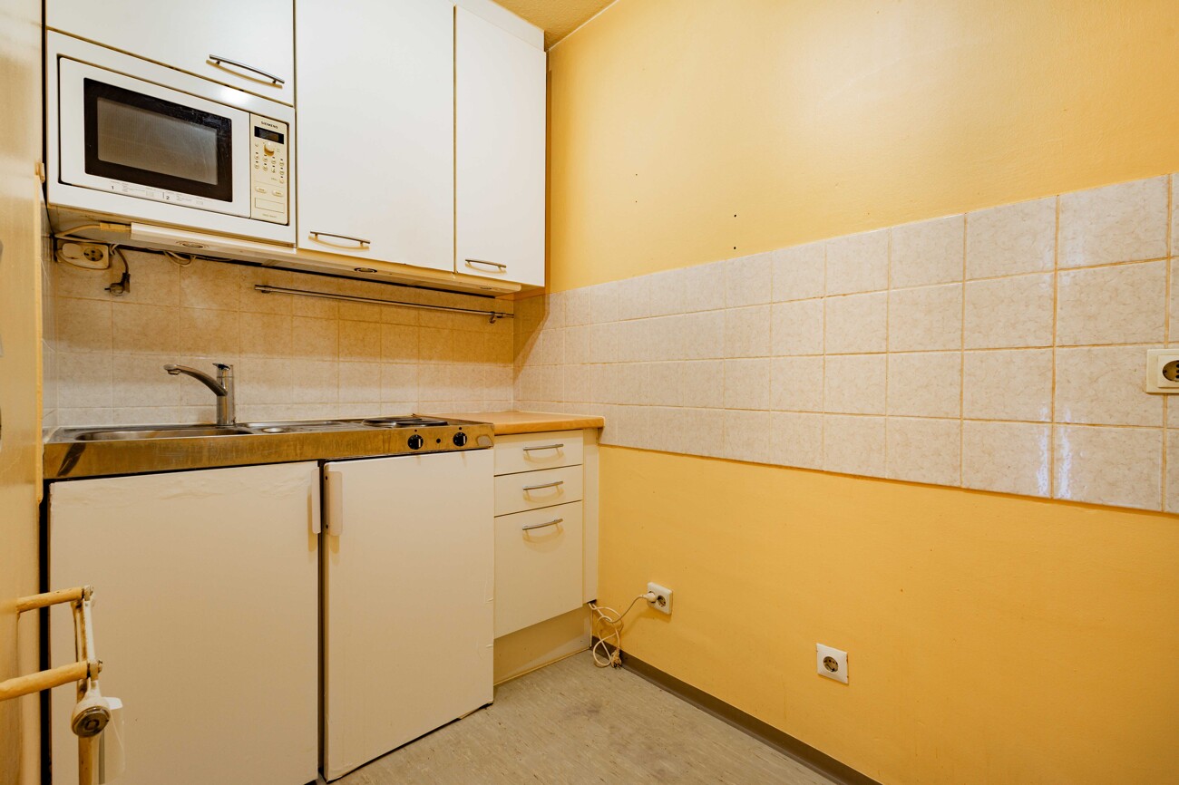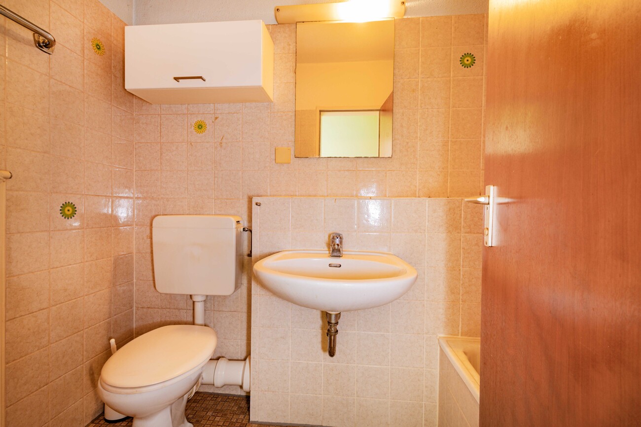 Der Wohn und Schlafbereich ist hell und funktional geschnitten. Große Panorama Fenster in westlicher Ausrichtung sorgen am Abend für natürliche Lichtakzente. Die eingebaute Küche ist bereits vorhanden. Das Badezimmer ist mit einer Duschwanne ausgestattet. Insgesamt befindet sich die Wohnung in renovierungsbedürftigem Zustand und bietet damit die Möglichkeit, eigene Vorstellungen umzusetzen.