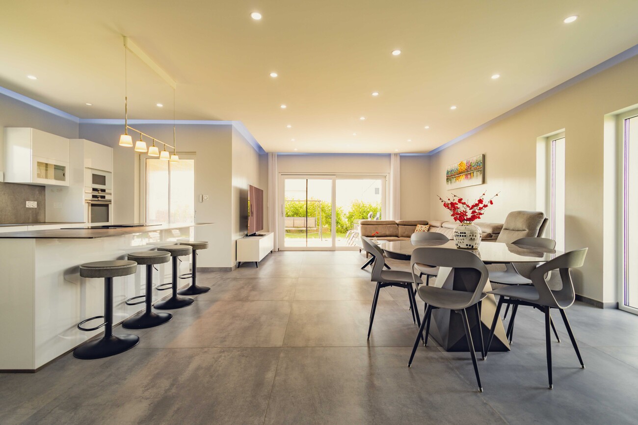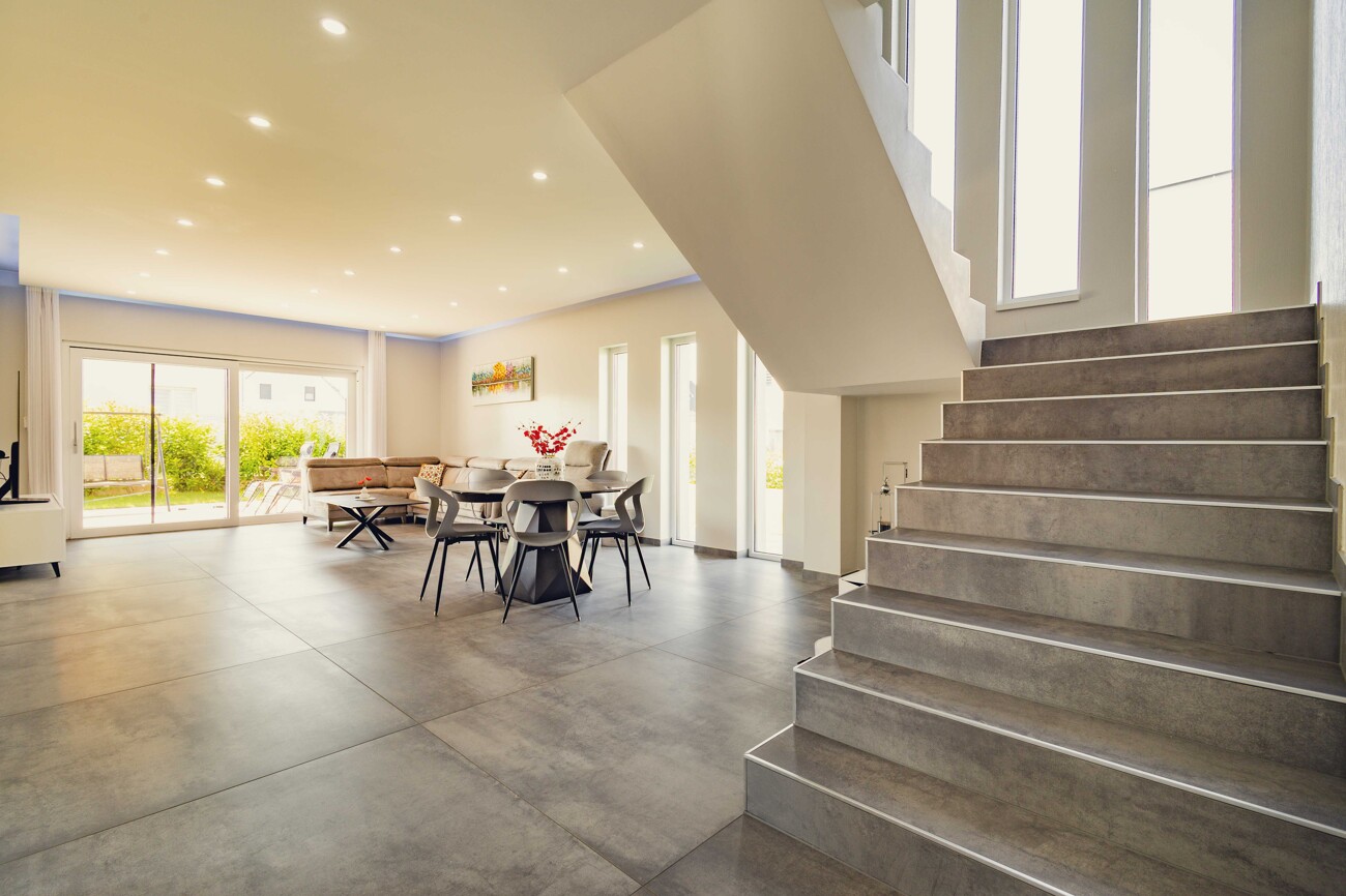 Der großzügige, helle Wohn- und Essbereich bildet das Herzstück des Hauses. Die offen gestaltete Küche mit Kochinsel ist hochwertig ausgestattet und fügt sich harmonisch in das Gesamtkonzept ein. Elektrische Fußbodenheizung sorgt im gesamten Haus für angenehme Wärme, während dimmbare LED-Spots eine stimmungsvolle Lichtatmosphäre schaffen. Eine integrierte Trinkwasser-Aufbereitungsanlage trägt zur hohen Lebensqualität bei.