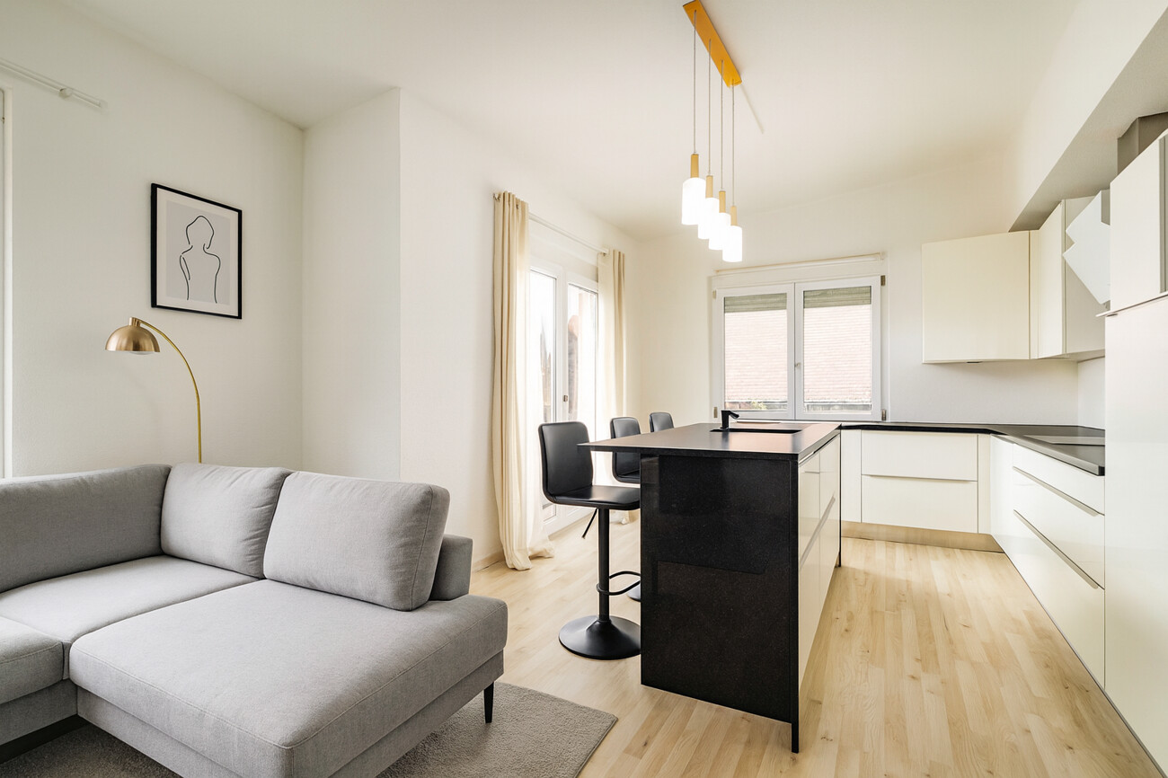 Das Herzstück der Wohnung bildet der helle Wohnbereich mit Zugang zum Balkon, der einen weiten Blick über die Dächer von Lahr eröffnet - ideal, um sonnige Stunden zu genießen oder den Tag entspannt ausklingen zu lassen.