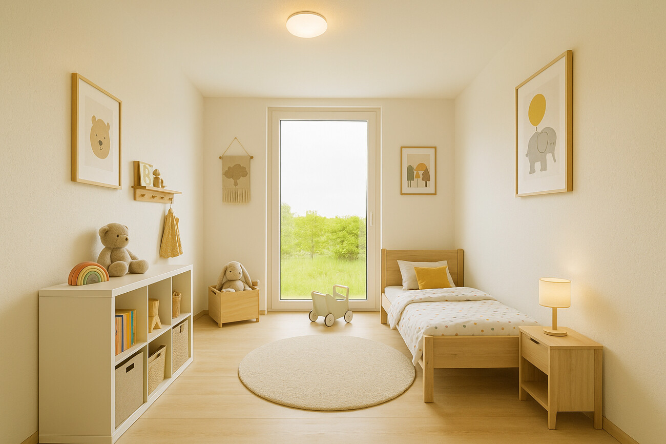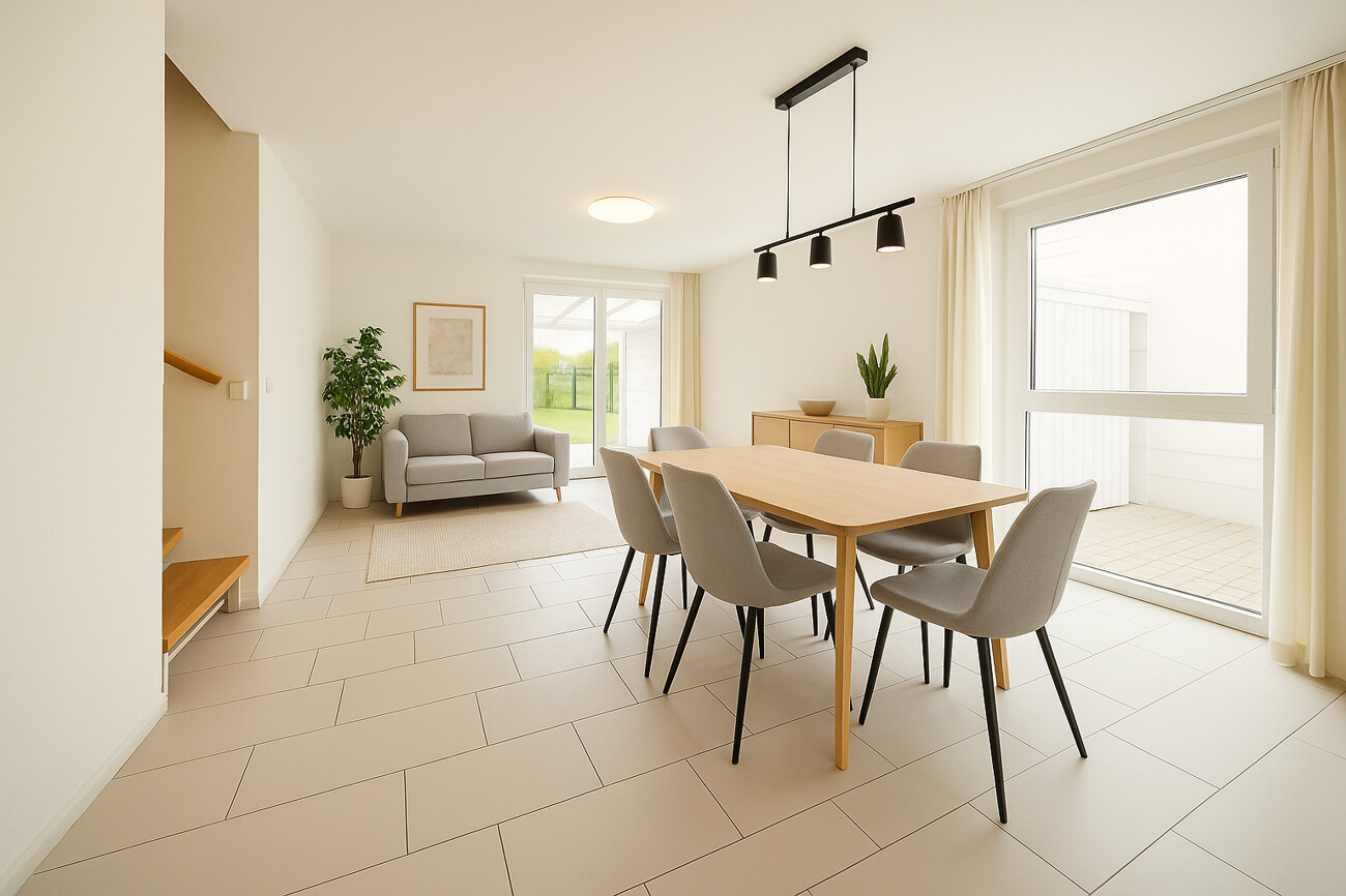 Bereits beim Betreten fällt die helle und freundliche Atmosphäre auf. Im Erdgeschoss bildet der großzügige Wohn- und Essbereich das Herzstück des Hauses. Dank der bodentiefen Fenster ist der Raum lichtdurchflutet und schafft ein angenehmes Wohngefühl. Angrenzend befindet sich die moderne, einladende Küche, die sowohl funktional als auch optisch überzeugt. Ein Gäste-WC komplettiert diese Ebene und sorgt für zusätzlichen Komfort.