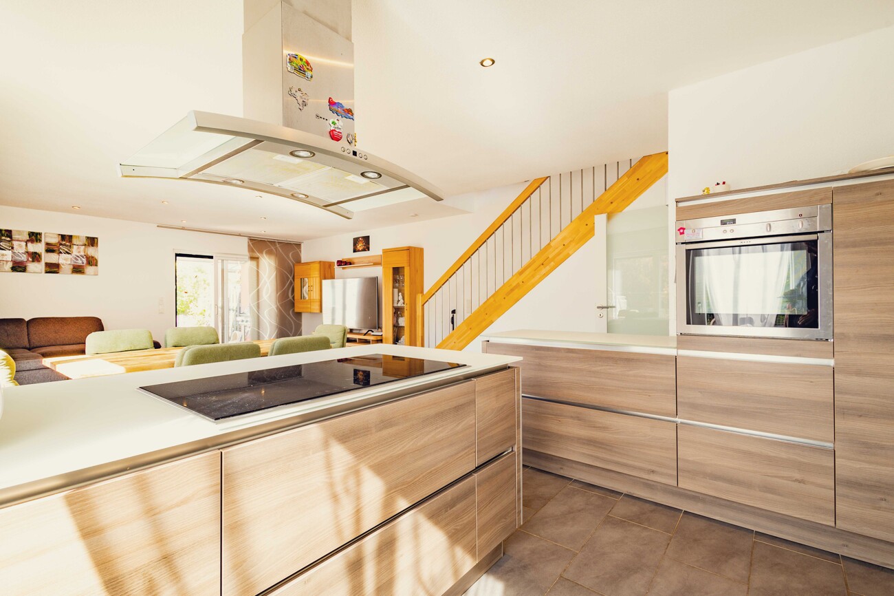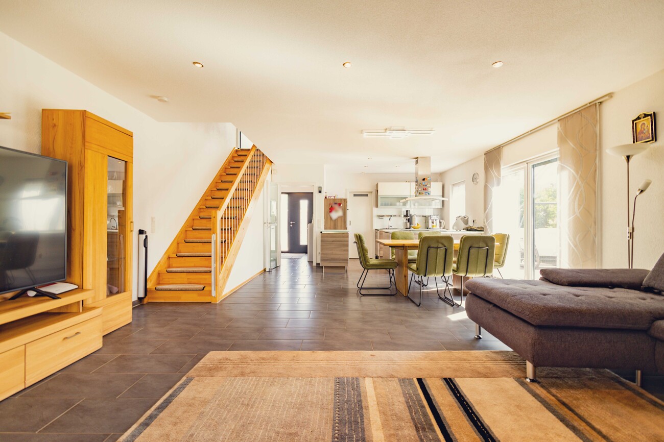 Im Erdgeschoss erwartet Sie ein offener Wohn- und Essbereich mit direktem Zugang zum Garten. Die hochwertig ausgestattete Einbauküche ist funktional in den Wohnbereich integriert. Angrenzend befindet sich ein geräumiger Hauswirtschaftsraum mit viel Staufläche.