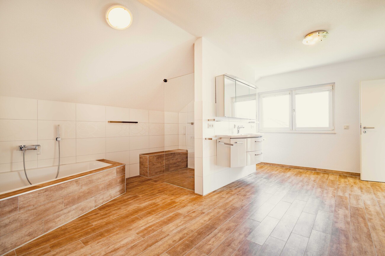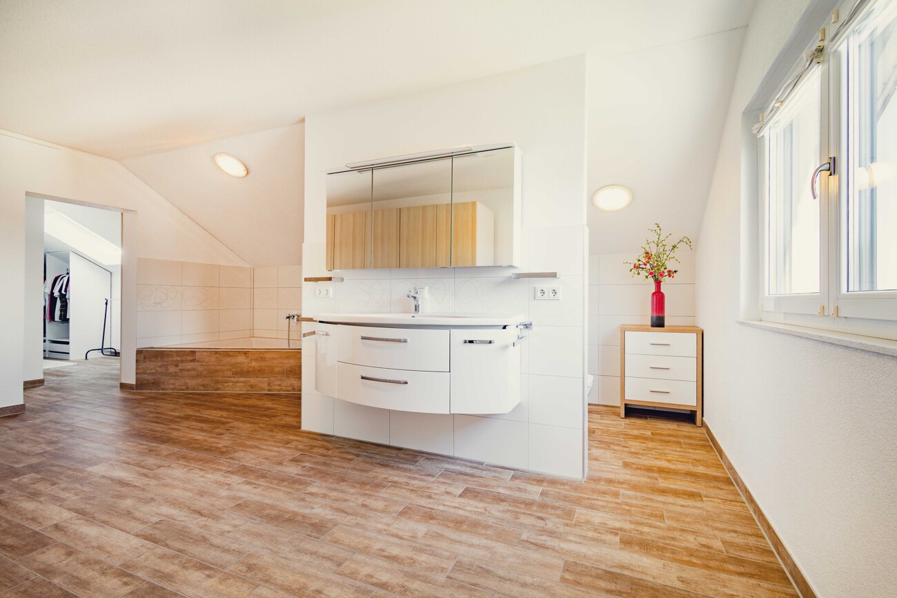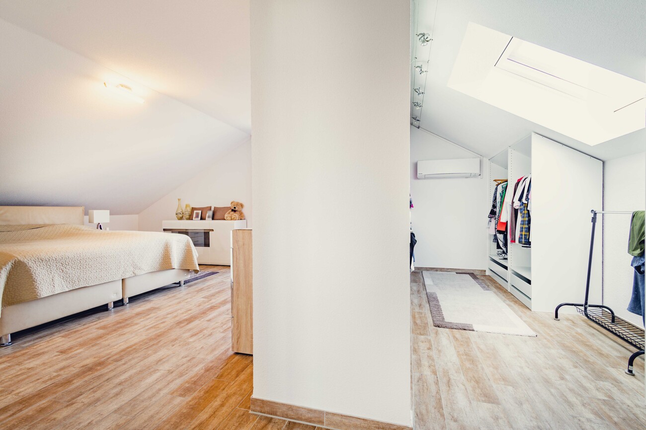 Das Dachgeschoss beeindruckt mit einem großzügigen Schlafzimmer samt angrenzendem Ankleidebereich und einem luxuriösen Masterbad. Auch hier ist eine Klimaanlage vorhanden. Ein Balkon ergänzt das Raumangebot auf dieser Etage.