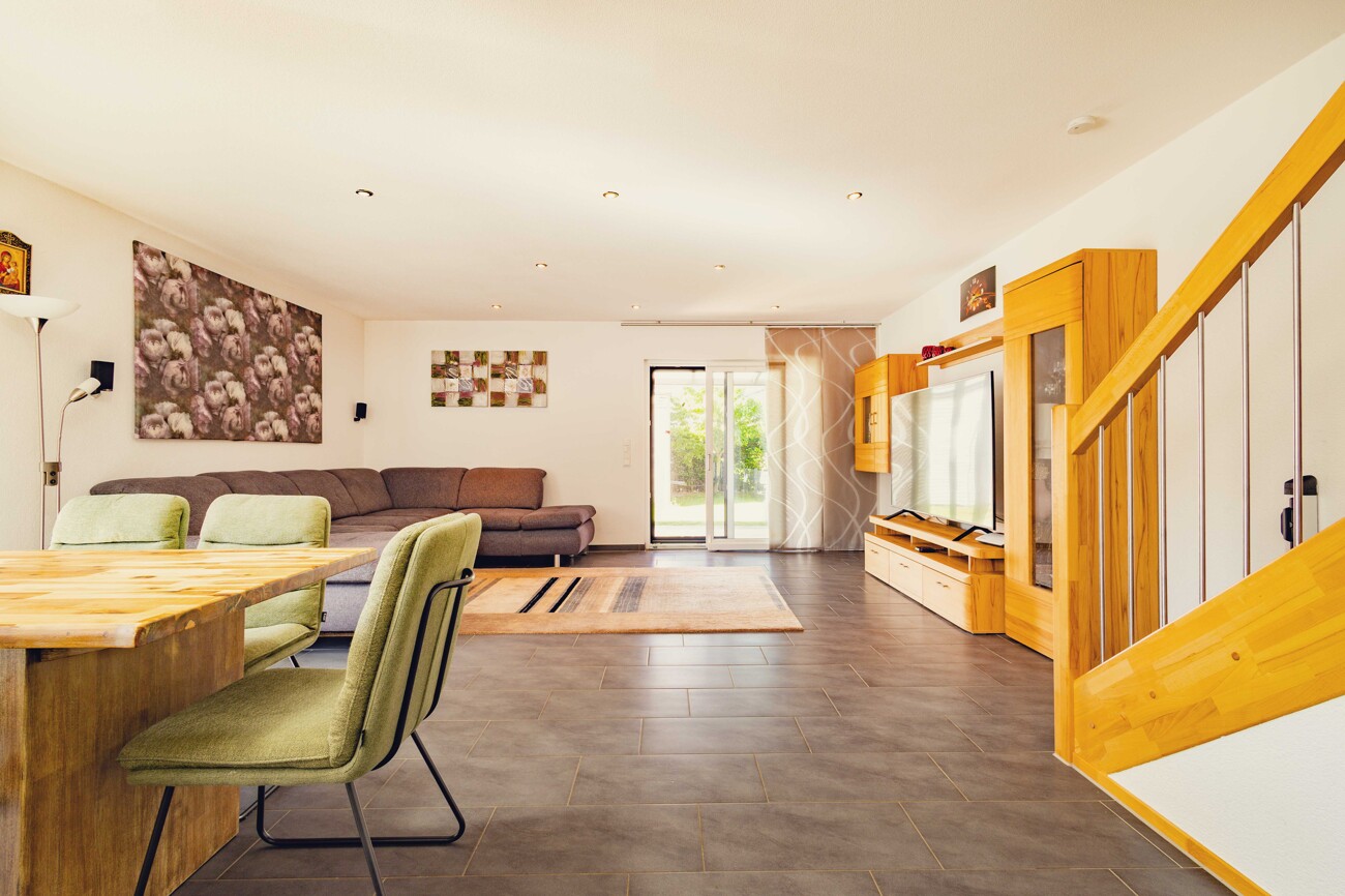 Im Erdgeschoss erwartet Sie ein offener Wohn- und Essbereich mit direktem Zugang zum Garten. Die hochwertig ausgestattete Einbauküche ist funktional in den Wohnbereich integriert. Angrenzend befindet sich ein geräumiger Hauswirtschaftsraum mit viel Staufläche.