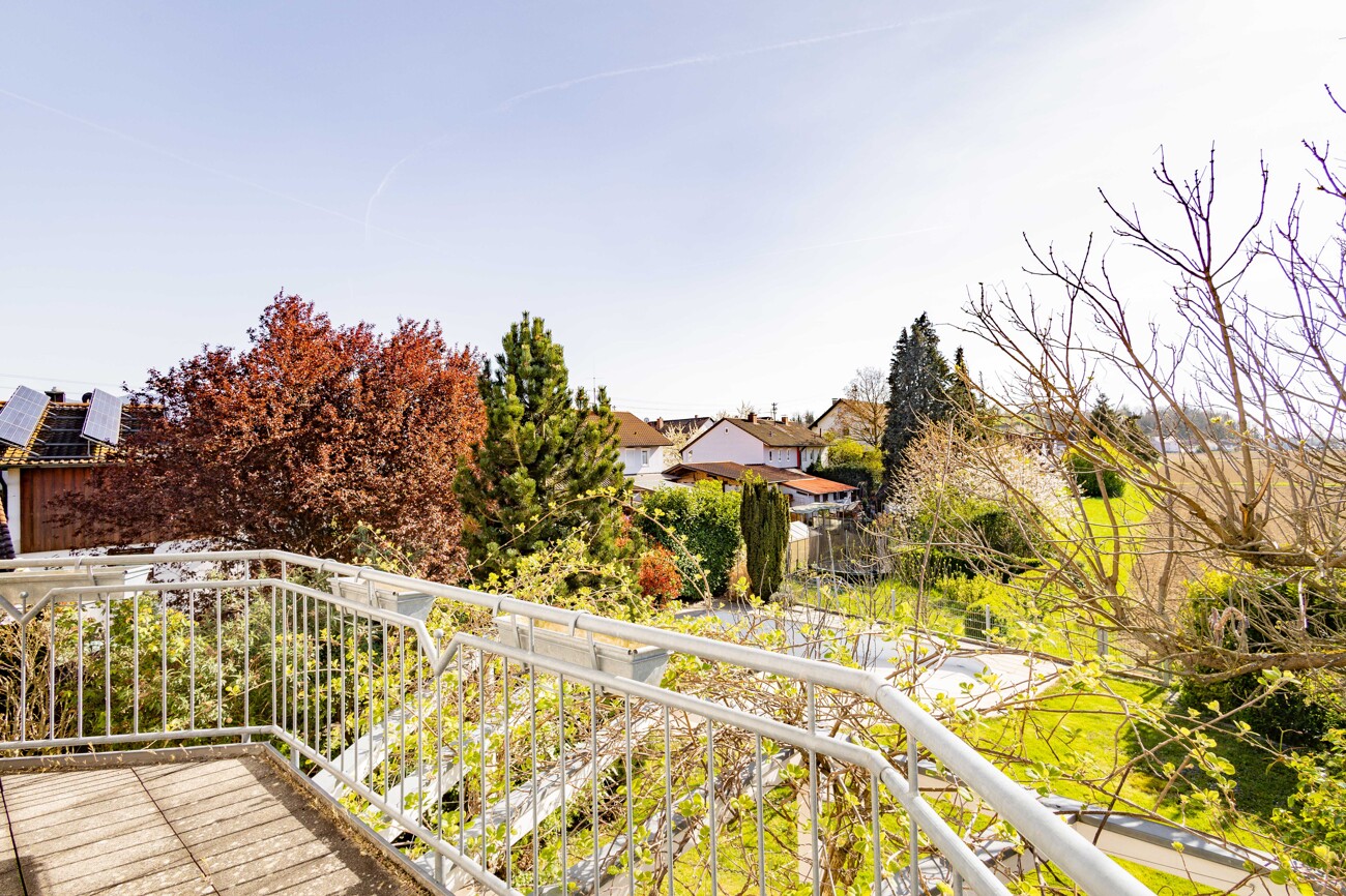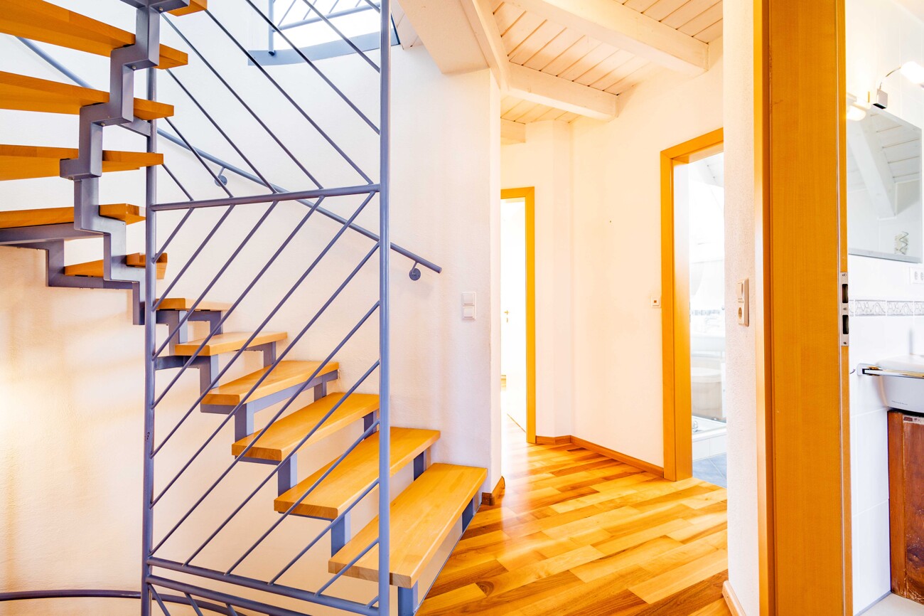 Im Obergeschoss befinden sich das Elternschlafzimmer mit begehbarer Ankleide, zwei helle Kinderzimmer mit Balkonzugang und maßgefertigten Einbauschränken sowie ein großzügiges Familienbad mit Badewanne und Dusche und ein zusätzliches Duschbad. Die offene Sichtbalkenkonstruktion verleiht den Räumen besonderen Charme.