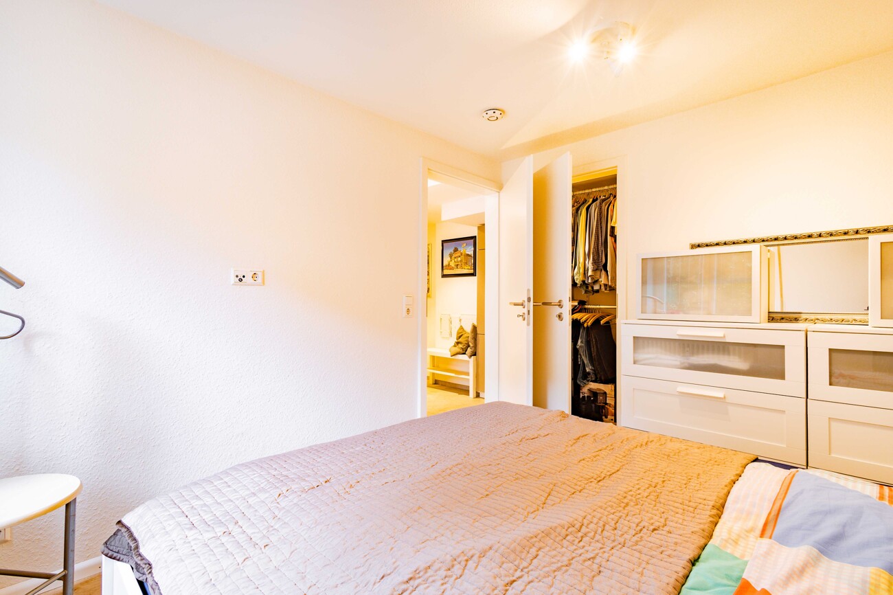 Die knapp 50m² Wohnfläche verteilt sich auf einen offenen Wohn- und Küchenbereich, ein Schlafzimmer mit hellem Boden und großem Fenster sowie einem direkt angrenzenden Ankleideraum. Das moderne Badezimmer ist mit einer bodentiefen, großzügigen Dusche, einem großen Waschbecken, einem Handtuchheizkörper und einem Fenster ausgestattet. Zusätzlich steht ein separater Waschraum innerhalb der Wohnung zur Verfügung, welcher ebenfalls als Abstellraum dienen kann. Ein kleiner Gartenbereich rundet das Angebot ab.