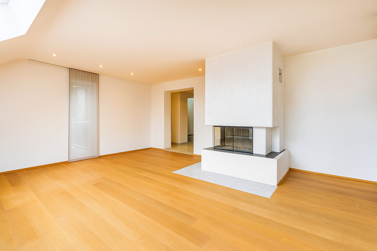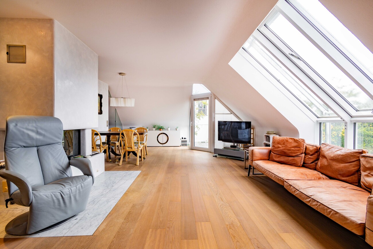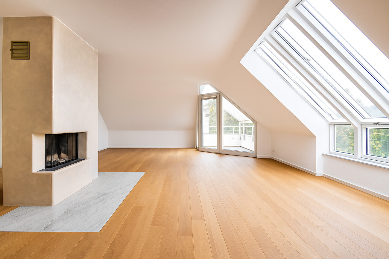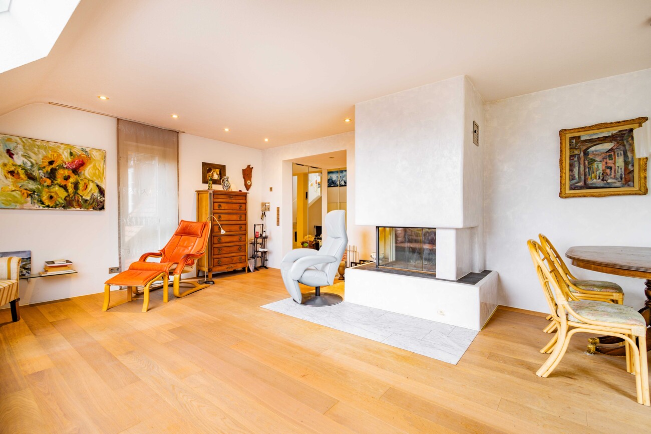 Die Wohnung befindet sich im Obergeschoss sowie im Dachgeschoss des Mehrfamilienhauses. Im Obergeschoss erwarten Sie ein heller und offen geschnittener Wohn- und Essbereich mit Zugang zu einem der beiden Balkone. Der offen gestaltete Bereich mit großen Fenstern, den hohen Decken und dem Ausblick über die Stadt rundet diesen imposanten Wohnbereich vollends ab. Das Highlight des offenen Raumes ist der Kamin in der Mitte sowie der nach Südwesten ausgerichtete Balkon. Eine großzügige Einbauküche lädt zum gemeinsamen Kochen ein. Das Gäste-WC mit Dusche bietet zusätzlichen Komfort.