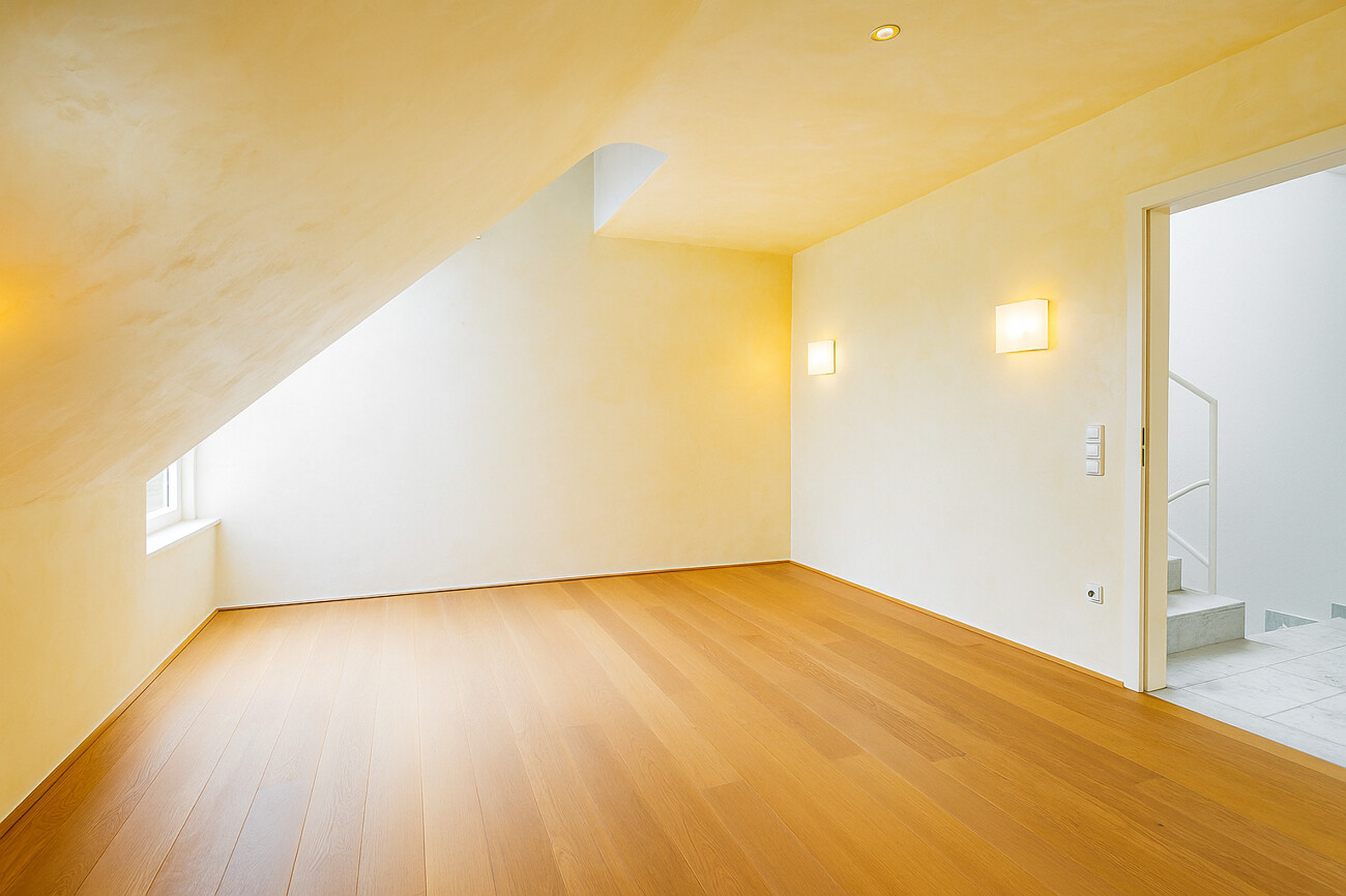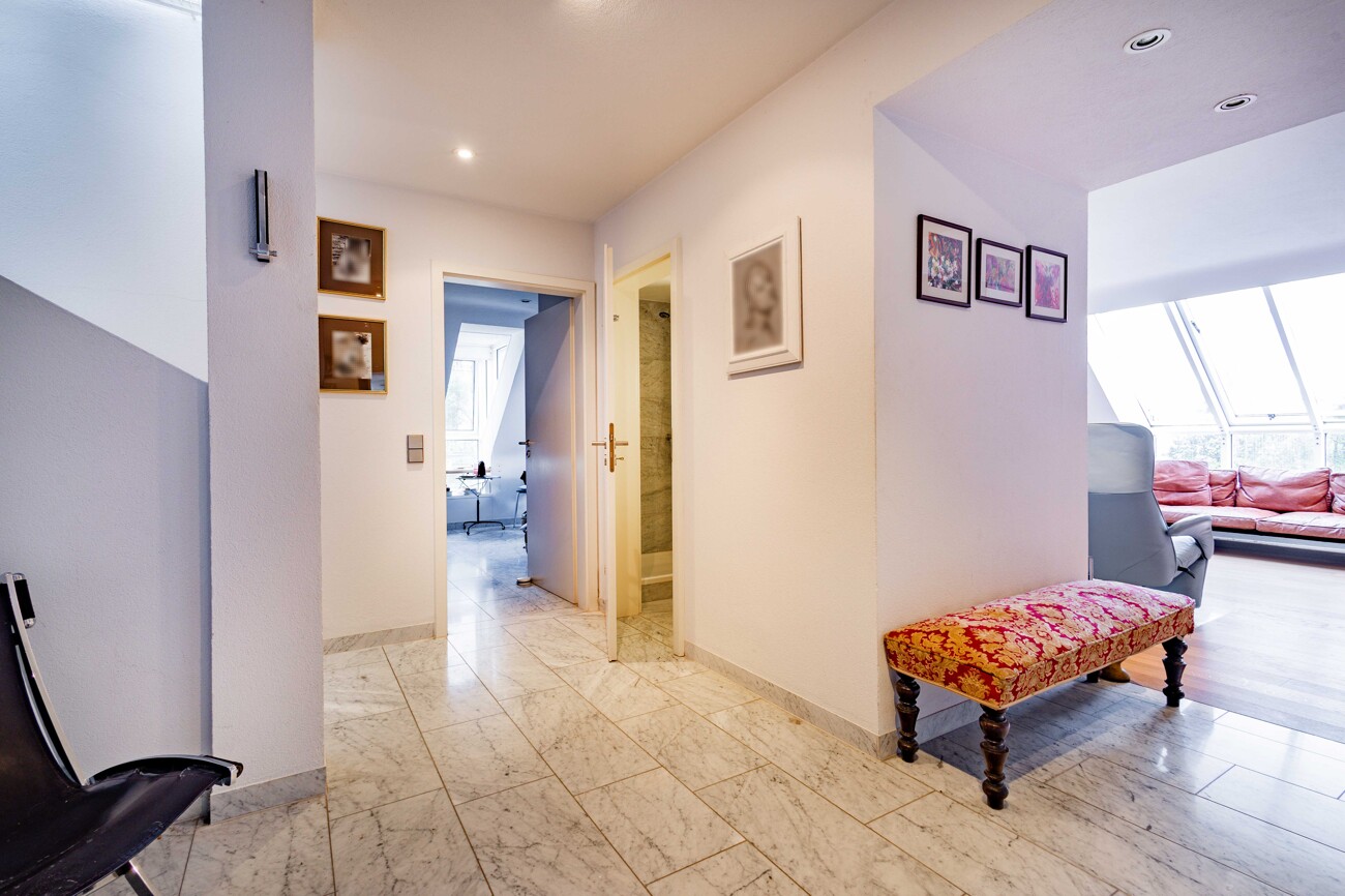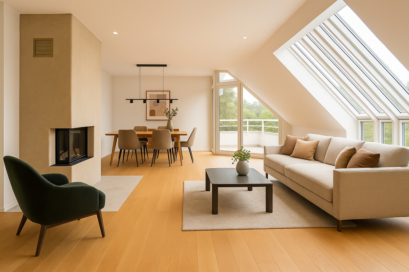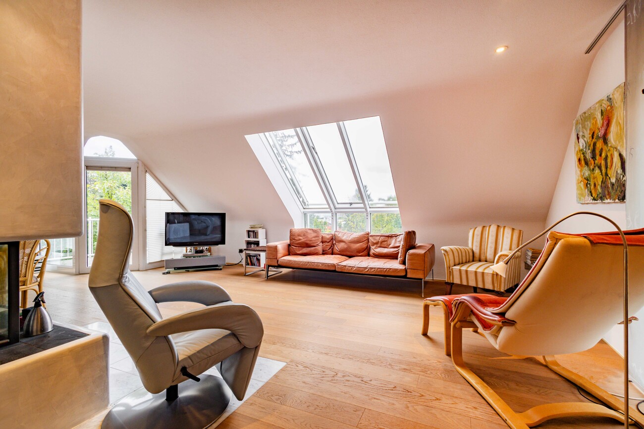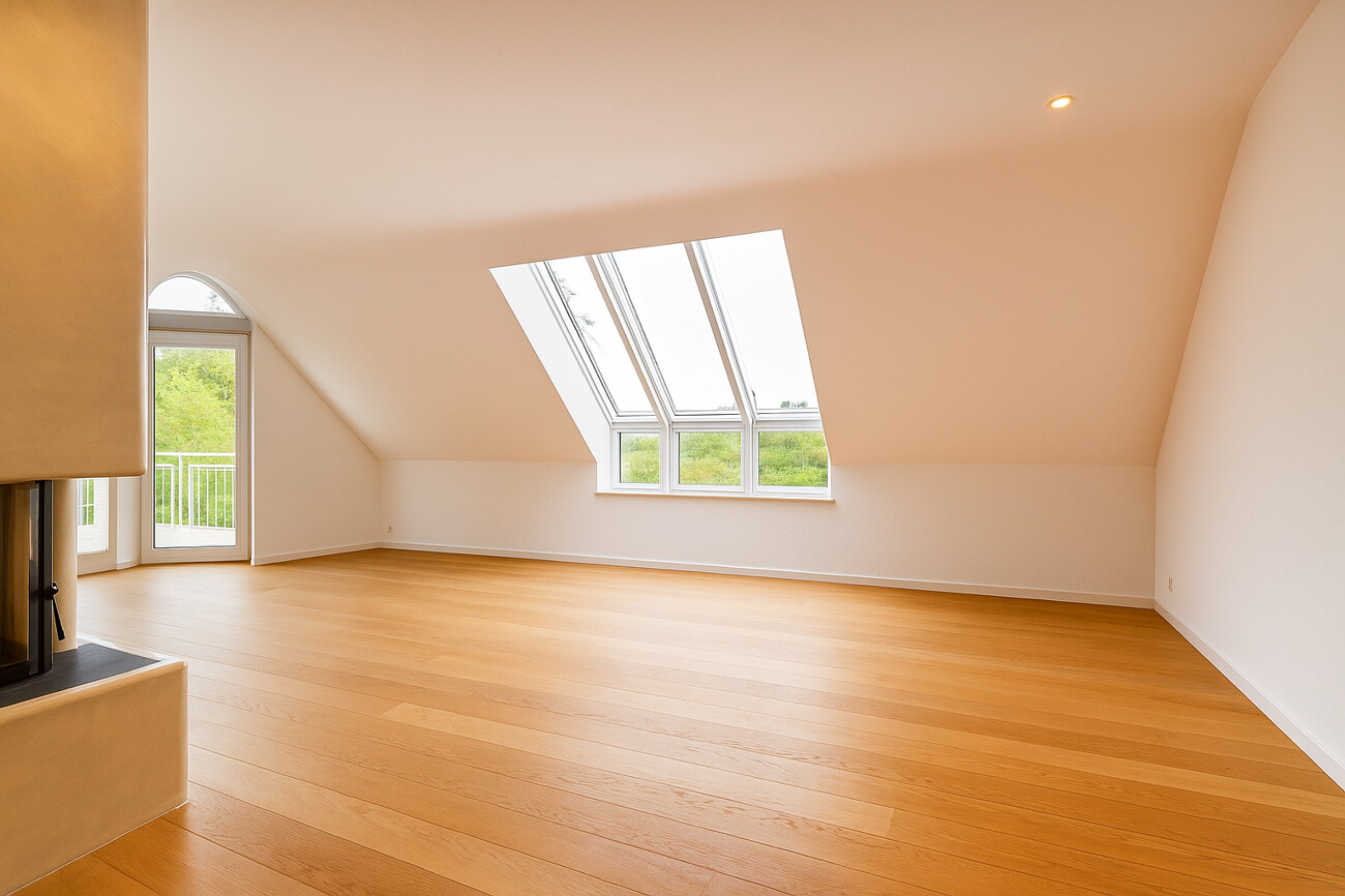 Die Wohnung befindet sich im Obergeschoss sowie im Dachgeschoss des Mehrfamilienhauses. Im Obergeschoss erwarten Sie ein heller und offen geschnittener Wohn- und Essbereich mit Zugang zu einem der beiden Balkone. Der offen gestaltete Bereich mit großen Fenstern, den hohen Decken und dem Ausblick über die Stadt rundet diesen imposanten Wohnbereich vollends ab. Das Highlight des offenen Raumes ist der Kamin in der Mitte sowie der nach Südwesten ausgerichtete Balkon. Eine großzügige Einbauküche lädt zum gemeinsamen Kochen ein. Das Gäste-WC mit Dusche bietet zusätzlichen Komfort.