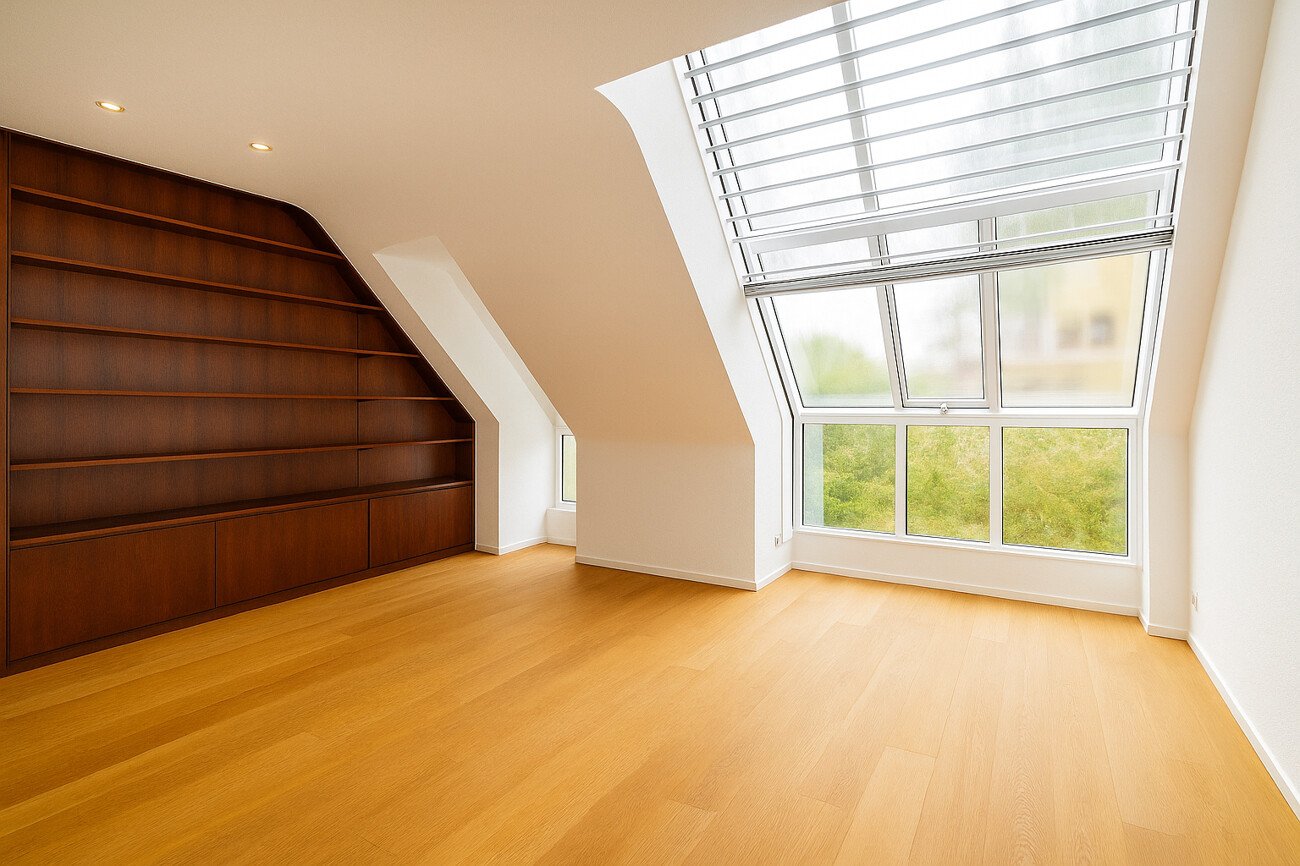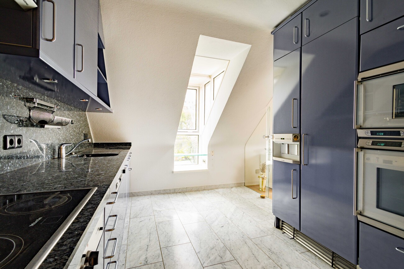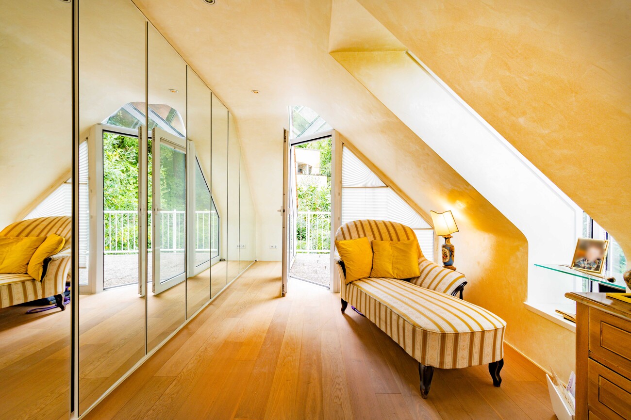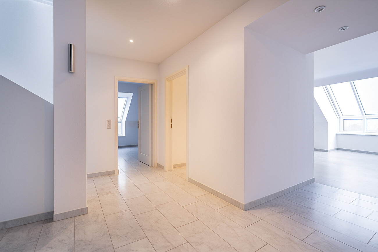 Die Wohnung befindet sich im Obergeschoss sowie im Dachgeschoss des Mehrfamilienhauses. Im Obergeschoss erwarten Sie ein heller und offen geschnittener Wohn- und Essbereich mit Zugang zu einem der beiden Balkone. Der offen gestaltete Bereich mit großen Fenstern, den hohen Decken und dem Ausblick über die Stadt rundet diesen imposanten Wohnbereich vollends ab. Das Highlight des offenen Raumes ist der Kamin in der Mitte sowie der nach Südwesten ausgerichtete Balkon. Eine großzügige Einbauküche lädt zum gemeinsamen Kochen ein. Das Gäste-WC mit Dusche bietet zusätzlichen Komfort.