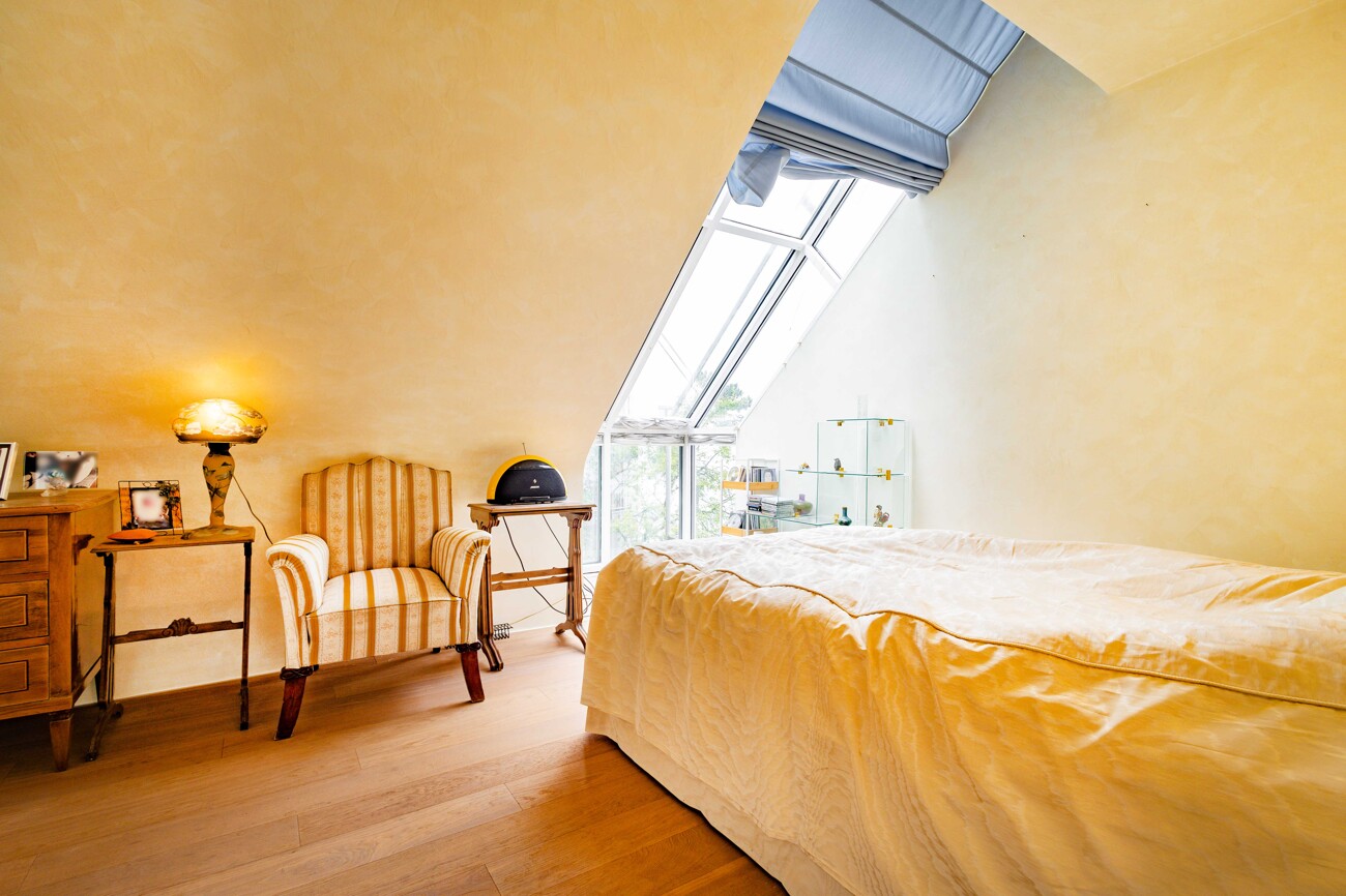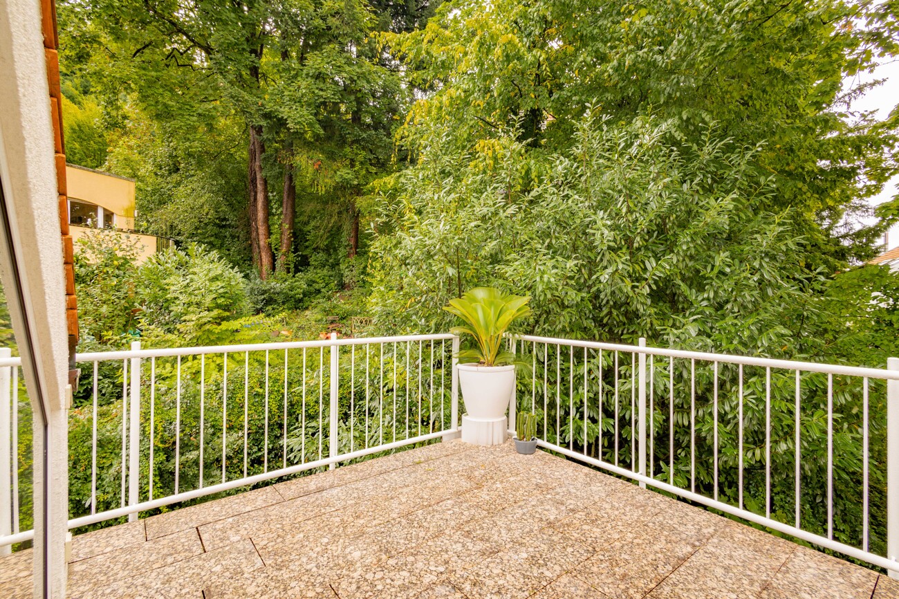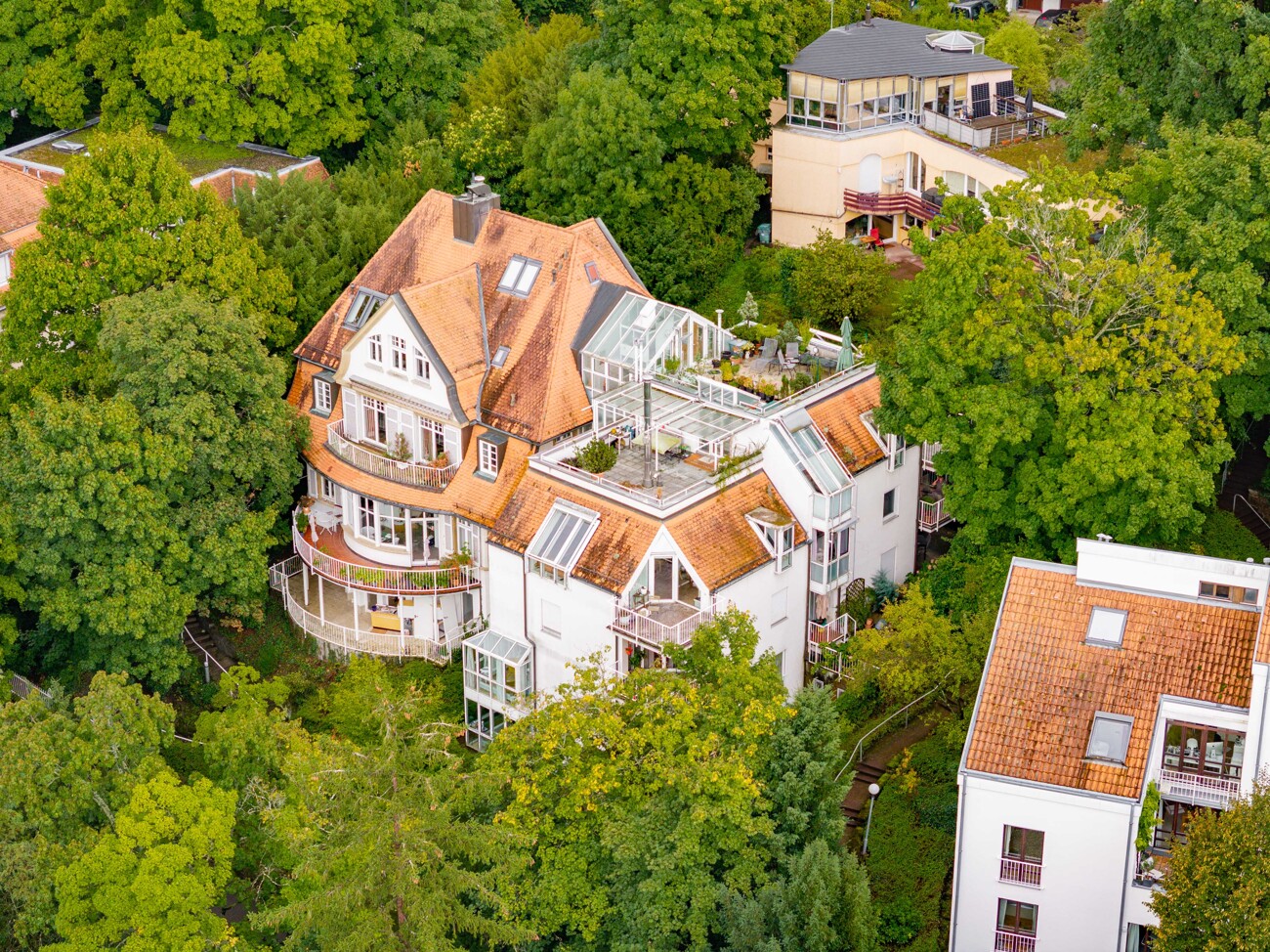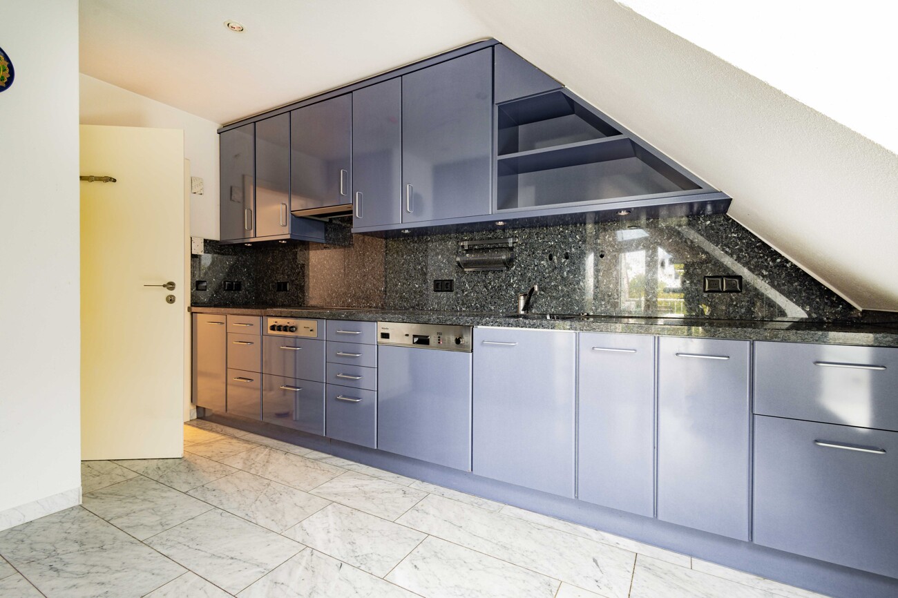 Die Wohnung befindet sich im Obergeschoss sowie im Dachgeschoss des Mehrfamilienhauses. Im Obergeschoss erwarten Sie ein heller und offen geschnittener Wohn- und Essbereich mit Zugang zu einem der beiden Balkone. Der offen gestaltete Bereich mit großen Fenstern, den hohen Decken und dem Ausblick über die Stadt rundet diesen imposanten Wohnbereich vollends ab. Das Highlight des offenen Raumes ist der Kamin in der Mitte sowie der nach Südwesten ausgerichtete Balkon. Eine großzügige Einbauküche lädt zum gemeinsamen Kochen ein. Das Gäste-WC mit Dusche bietet zusätzlichen Komfort.