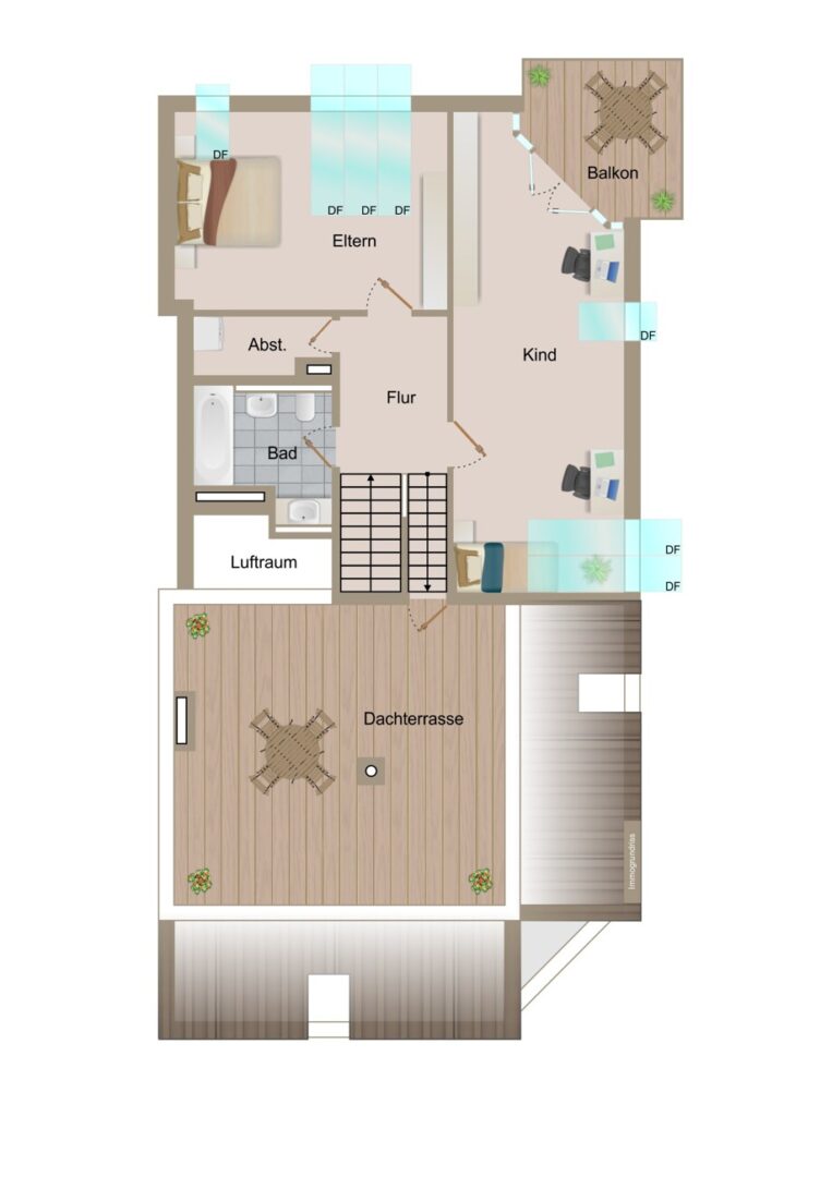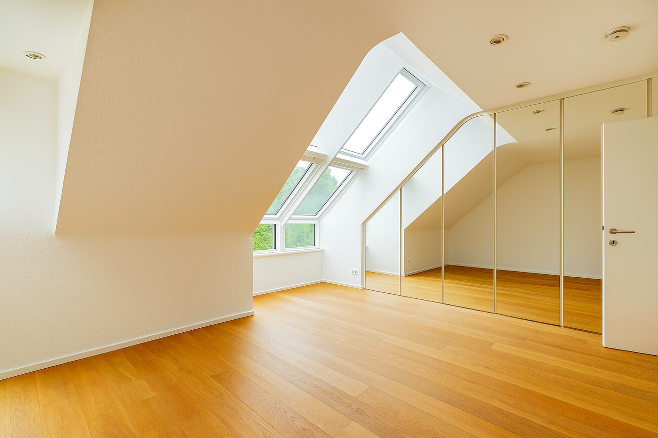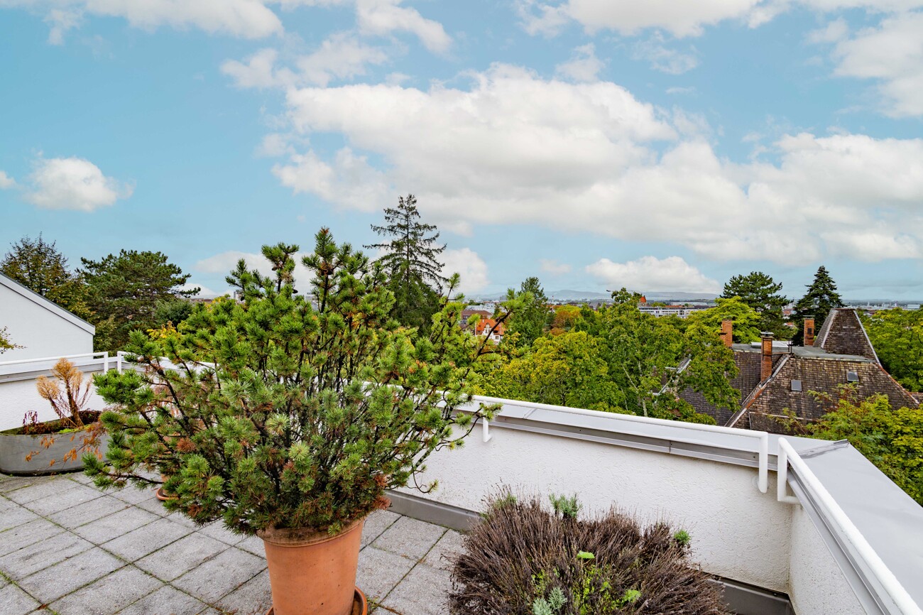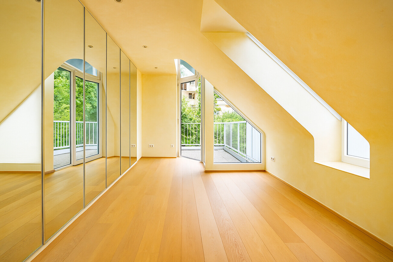 Das Dachgeschoss bietet Platz für zwei großzügige Schlafzimmer, von denen eines über einen eigenen Balkon mit Blick ins Grüne verfügt. Beide Räume sind ebenfalls mit großen Fenstern sowie maßgefertigten Einbauschränken ausgestattet. Zudem stehen Ihnen ein Badezimmer mit Duschwanne und großem Waschtisch sowie eine Abstellkammer mit Waschmaschinenanschluss zur Verfügung. Über den offen gestalteten Flur erreicht man die nach Westen ausgerichtete Dachterrasse mit herrlichem Blick über Freiburg.