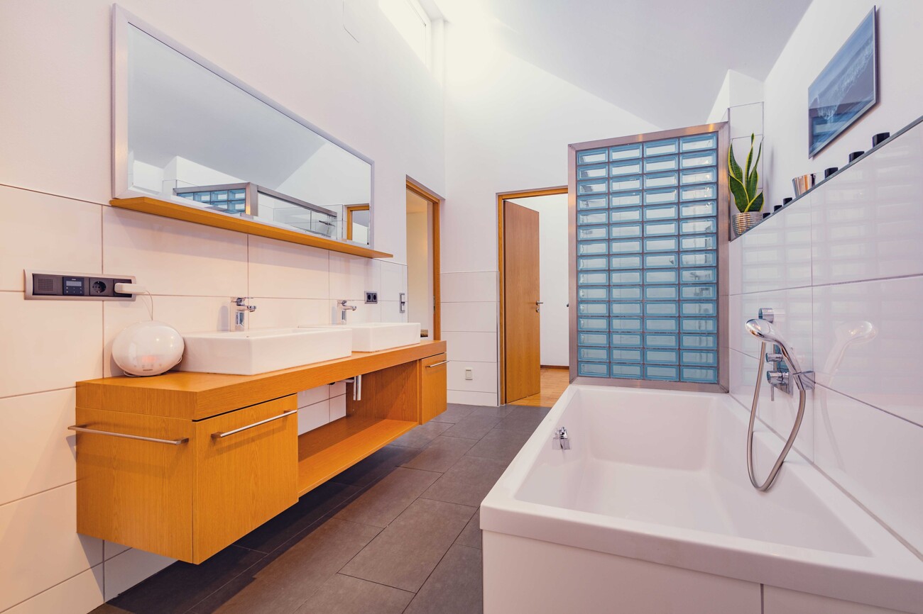 Im OG befindet sich auch das helle Schlafzimmer mit Panorama-Fenster und separater Ankleide. Das Bad-en-Suite grenzt direkt an und überzeugt mit Tageslicht, begehbarer Glas-Dusche, Badewanne sowie einem Doppelwaschtisch und einem WC. Die hochwertigen Armaturen vervollständigen die Design-Ausstattung.
