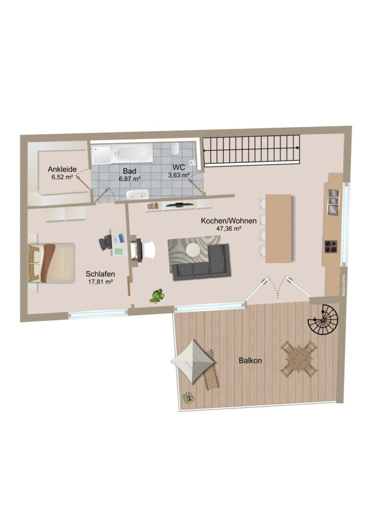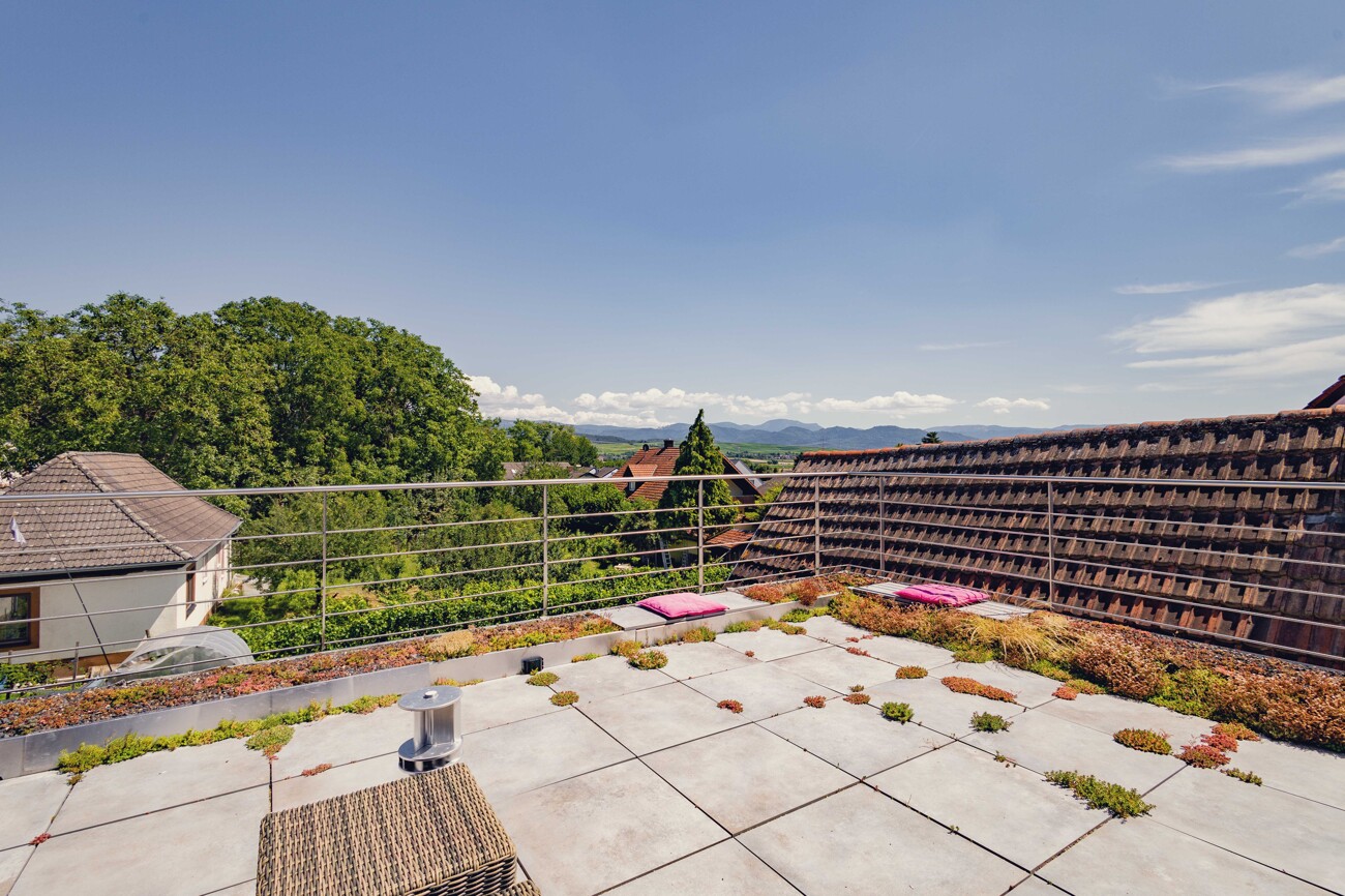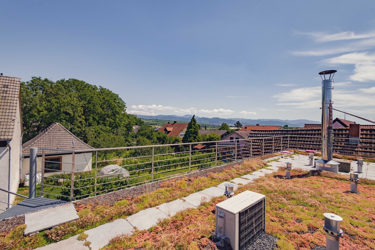 Im Obergeschoss empfängt Sie das Herzstück des Hauses: ein lichtdurchfluteter Wohn- und Essbereich mit großzügiger Deckenhöhe von bis zu 4,00 m sowie einen Kamin. Daran grenzt die offene Designerküche an, die mit einer großen Granit-Kücheninsel zum gemeinsamen Kochen, Sitzen und Genießen einlädt. Eine überdimensionale Glasfront eröffnet Ihnen den Blick und den direkten Zugang zur weitläufigen Terrasse mit Sonnenschutz-Markise. Von hier gelangen Sie mittels der Edelstahl-Aluminium-Wendeltreppe zum Dachbereich. Das Flachdach wurde 2024 aufwendig saniert. Mit neuem Dachaufbau, moderner ISO-Dämmung, hochwertiger Evalonfolie, einer extensiven Begrünung und Edelstahlgeländer ermöglicht dieser besondere Ort in entspannter Atmosphäre einen beeindruckenden Weitblick über den Schwarzwald.