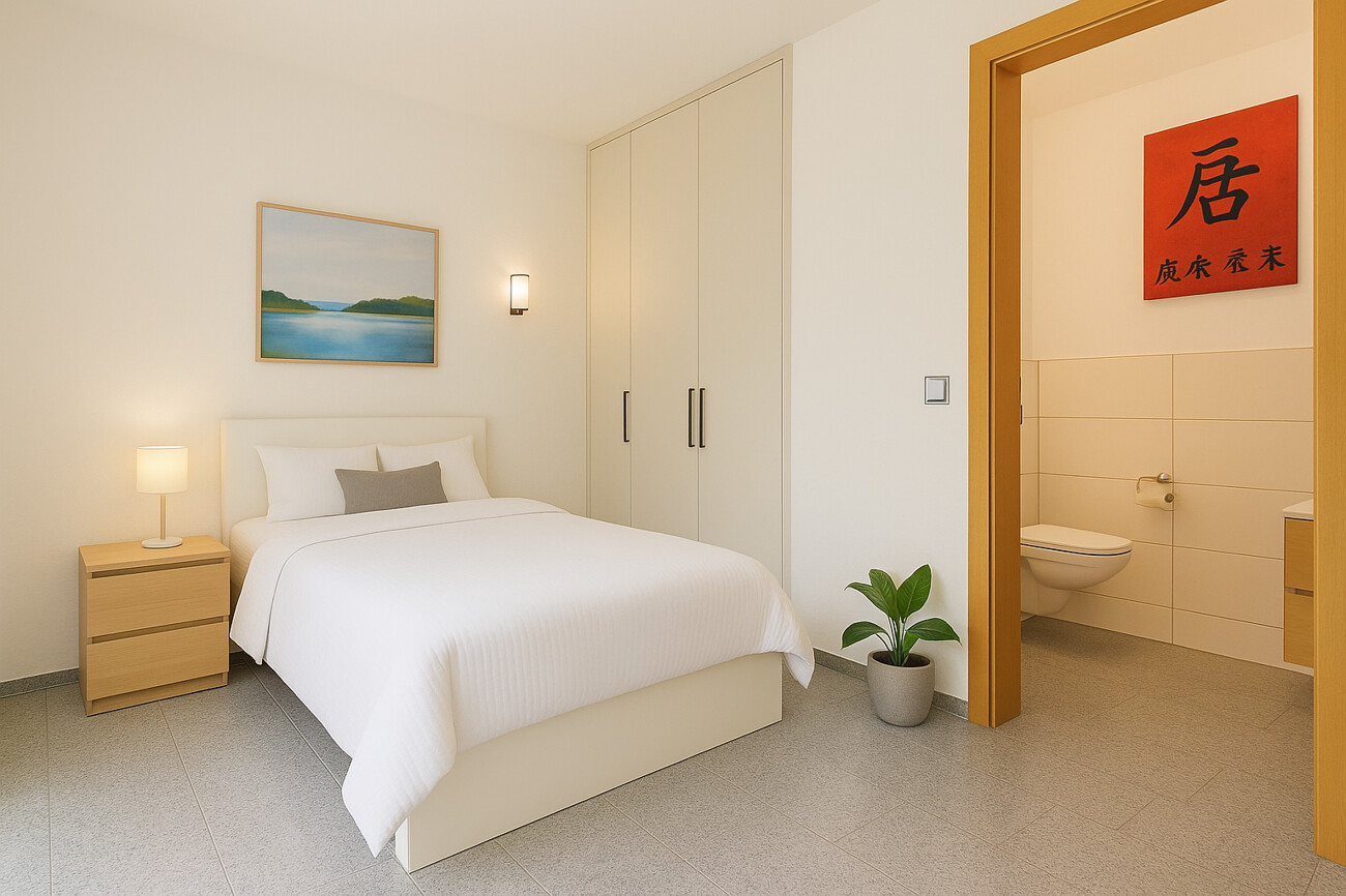 Im Erdgeschoss kann das geräumige Studio-Zimmer mit Terrasse verschiedenartig genutzt werden, bspw. als Kinder- und Gästezimmer. Das integrierte eigenständige Badezimmer mit Tageslicht und Dusche ermöglicht nicht nur Privatsphäre, sondern auch die Einnahme von Mieterträgen durch Vermietung dieser Einheit als Einliegerwohnung.