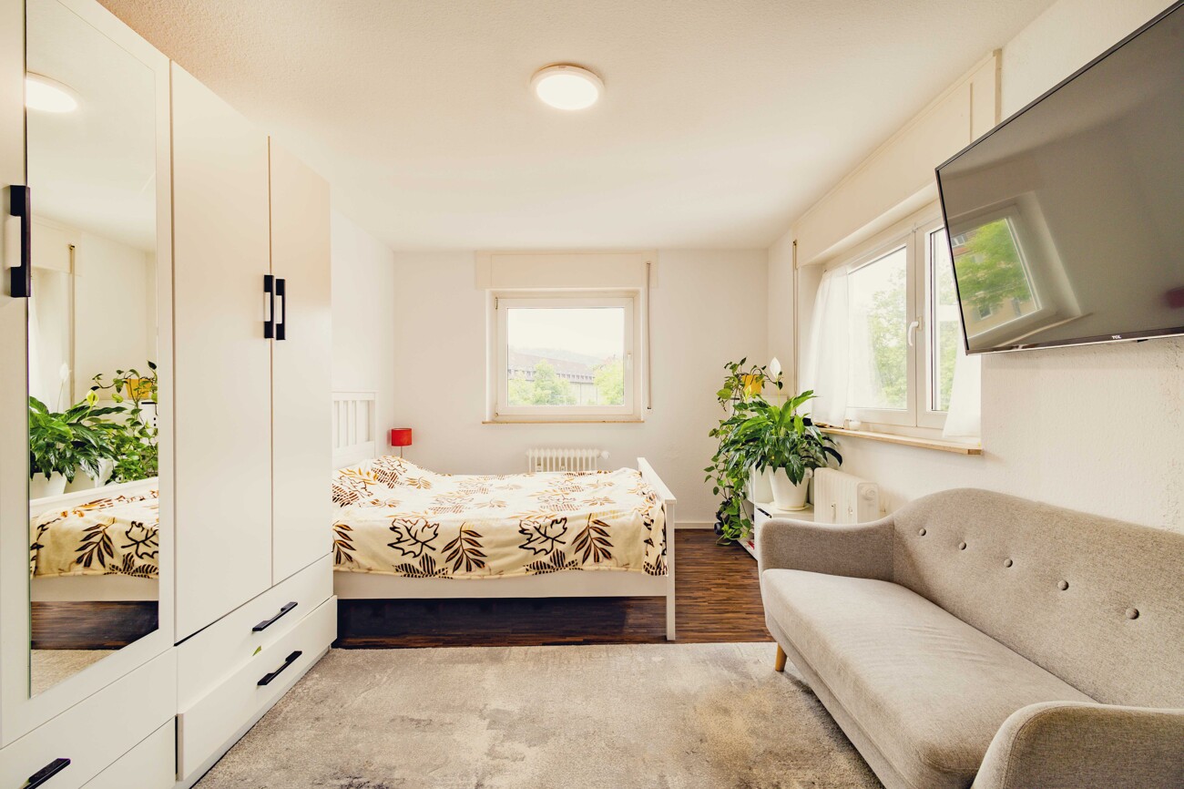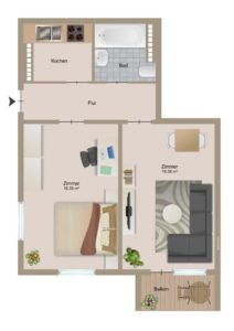 Auf ca. 48 m² Wohnfläche bietet sie ein komfortables Wohnambiente mit stilvollen Ausstattungsdetails und zeitgemäßen Standards. Das helle Wohnzimmer verfügt über einen Balkon, der zum Entspannen im Freien einlädt. Das geräumige Schlafzimmer bietet ausreichend Platz für einen großen Kleiderschrank. Sowohl Wohn- als auch Schlafbereich sind mit einem hochwertigen Holzboden ausgestattet.